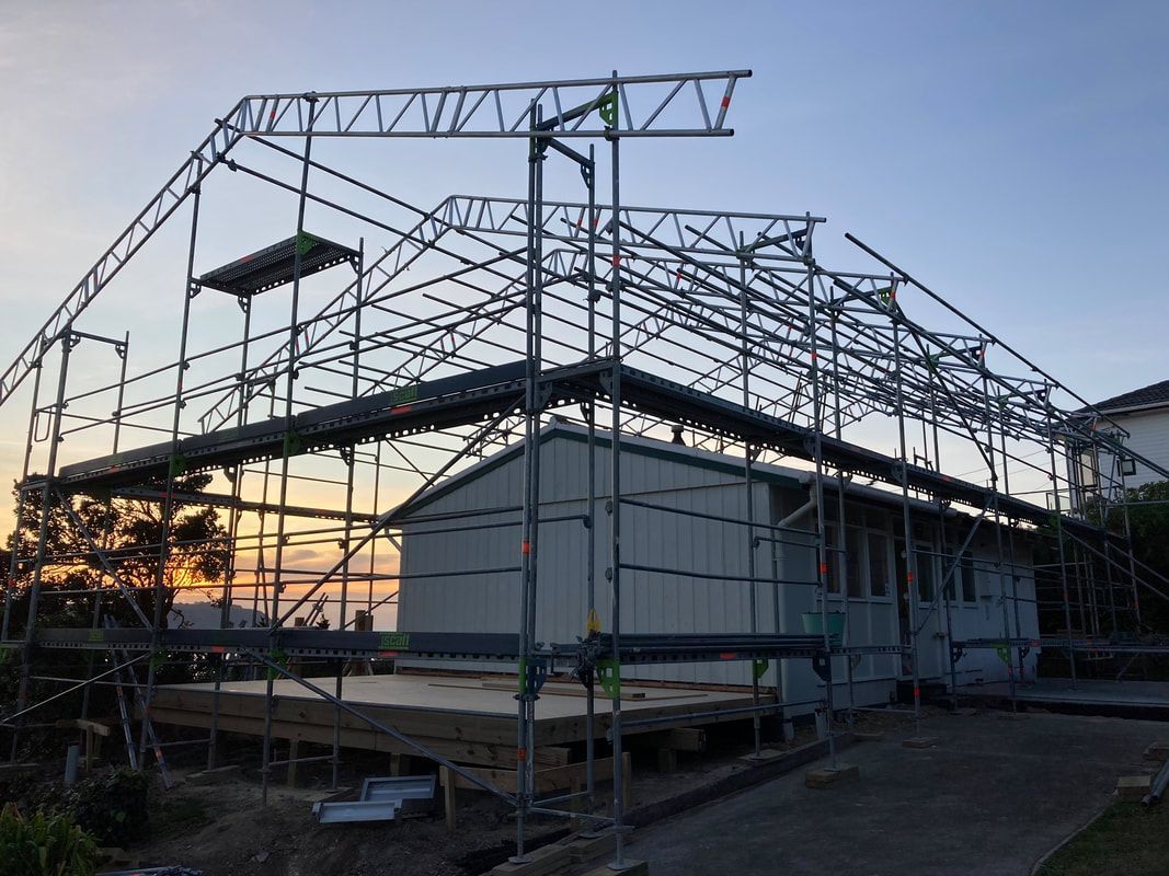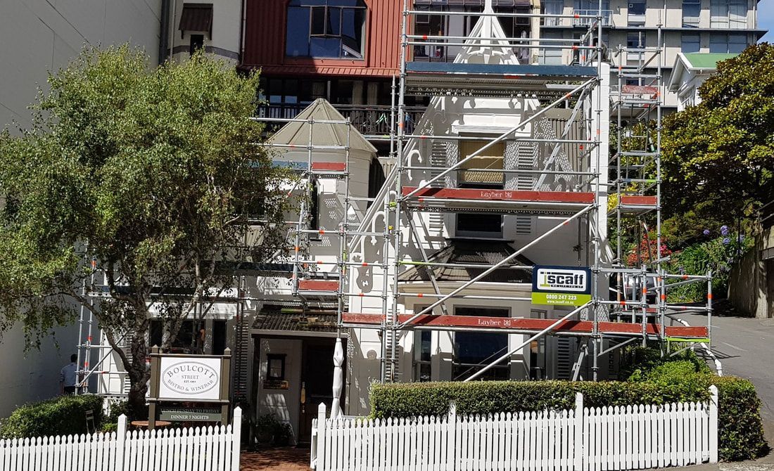 A typical Wellington multipurpose scaffolding for roof edge protection, wood repairs and painting of weatherboards, balustrades, soffits and windows. The site in parts was very narrow and had a long steep access.