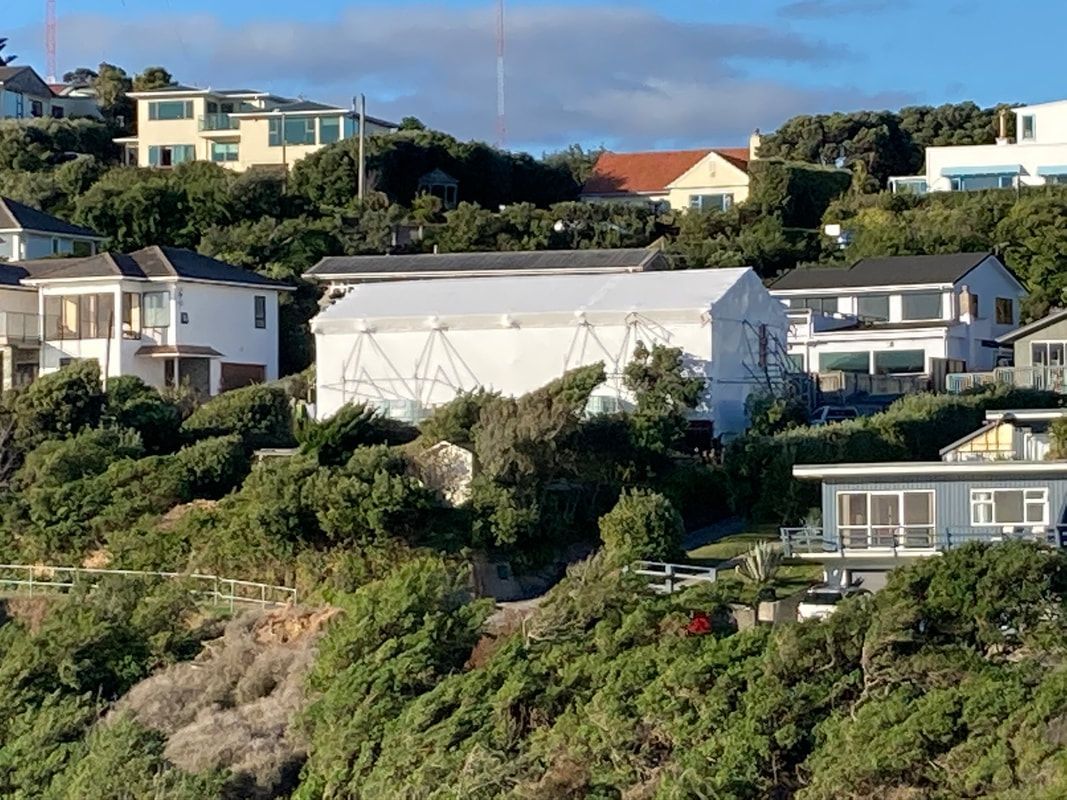 The house was completely wrapped for major renovation works and building of an addition. This was in an extra high wind zone which required an engineered scaffolding structure with extra heavy weights.