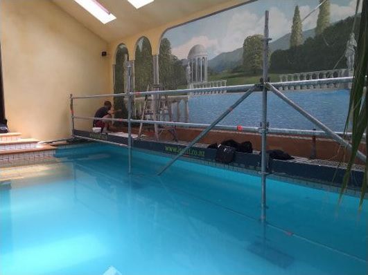 This delicate scaffolding work required the team to base out under water and to continue erecting the scaffolding from within the pool to set up the working platform for restoring the artwork on the pool wall.
